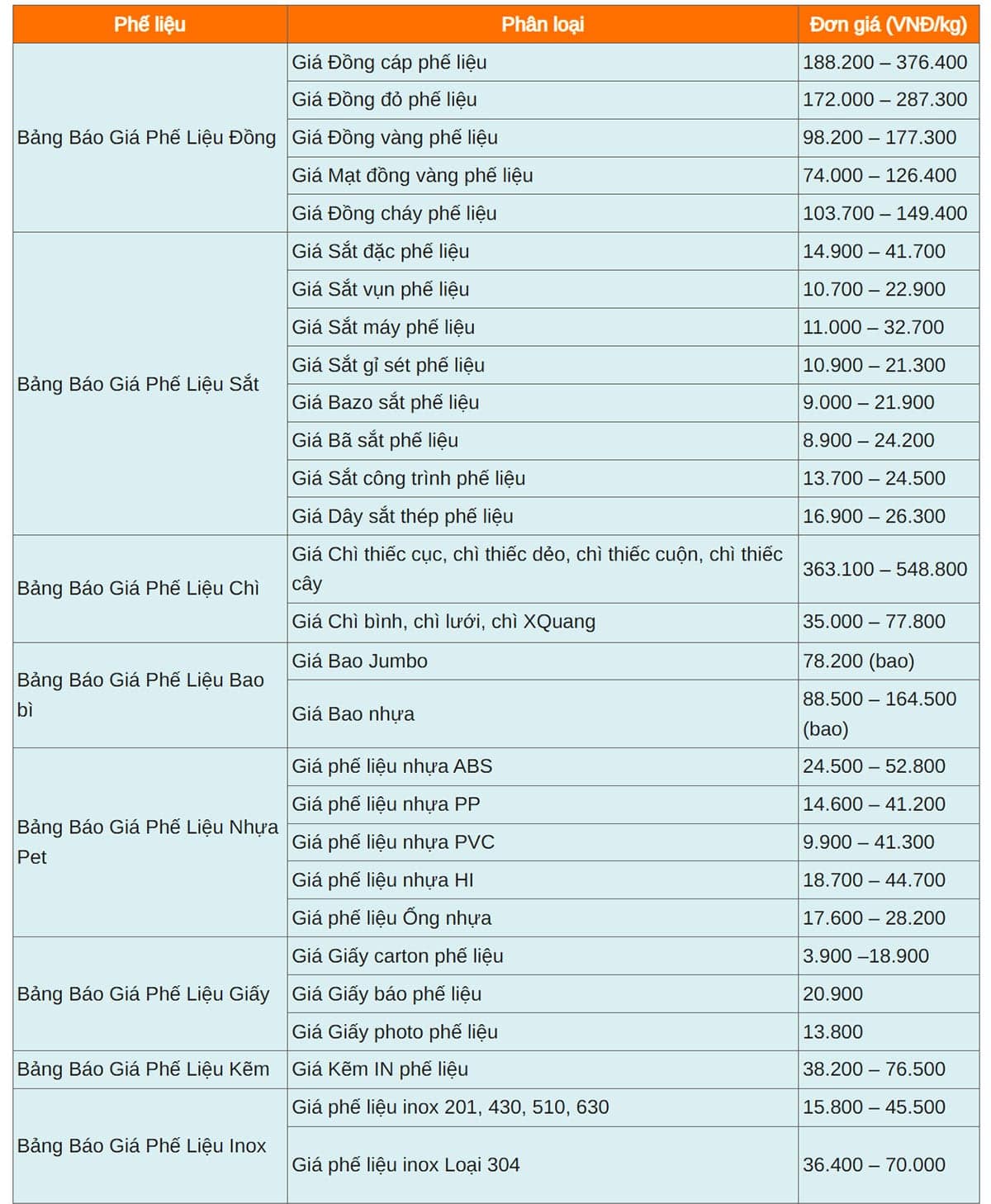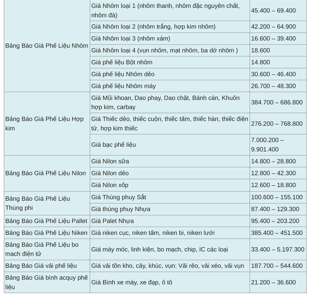 Hiện nay bảng giá thu mua phế liệu mới nhất hiện nay các loại phụ thuộc nhiều vào tình hình kinh tế nước ngoài cũng như số lượng, chất lượng, vị trí địa lý và chủng loại hàng hóa khách hàng bán. Dưới đây là bảng giá thu mua phế liệu mới nhất hiện nay . Bảng giá phế liệu mới nhất tháng 12 năm 2025, luôn có thể tốt hơn dưới sự thỏa thuận của khách hàng.